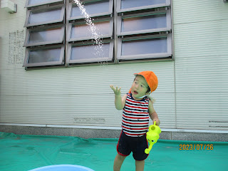 2023年7月26日水曜日 今日の様子 水あそびをしました💦水あそびができないお友だちは、お部屋で好きなあそびを楽しみました!★りす組★★うさぎ組★★ぞう組★★☆★今日の給食★☆★・ビビンバ風・白菜とトマトのナムル・中華スープ・バナナ★離乳食後期★・かゆ・鶏肉とチンゲン菜のだし煮・人参とトマトのサラダ・スープ★☆午後のおやつ☆★・牛乳・チーズ入りふりかけおにぎりごちそうさまでした!
